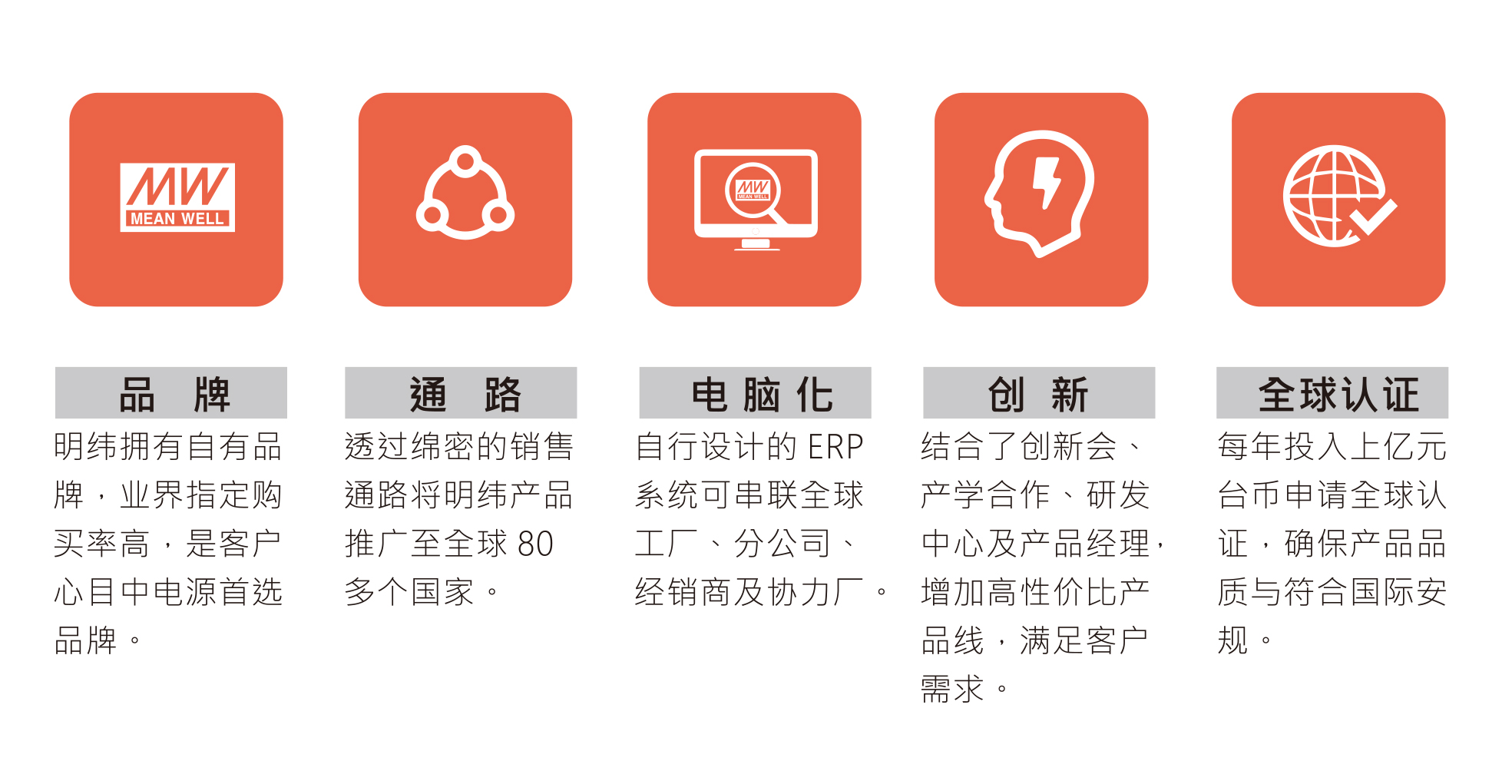 明緯秉持「您信賴的電源伙伴」的理念,堅持提供最優質的電源產品與服務。經過多年的努力與耕耘,明緯已建構起全球經銷通路網絡,能快速提供全球在地化服務。