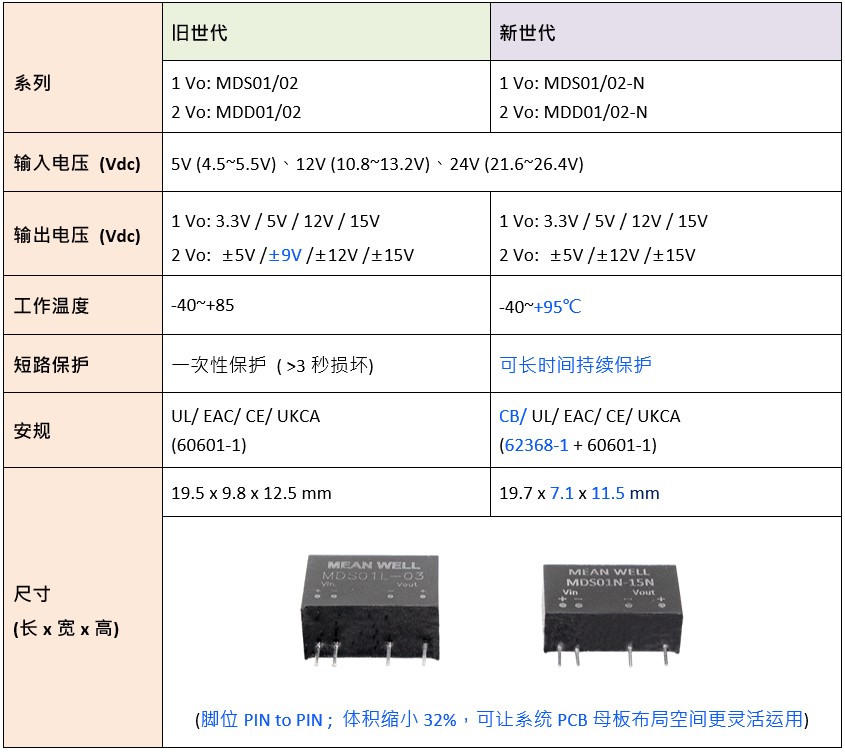 明緯模塊型醫療級DC-DC轉換器繼MDS01/02及MDD01/02系列后新上市性價比更好的MDS01/02-N、MDD01/02-N系列,新舊世代主要差異如下:
