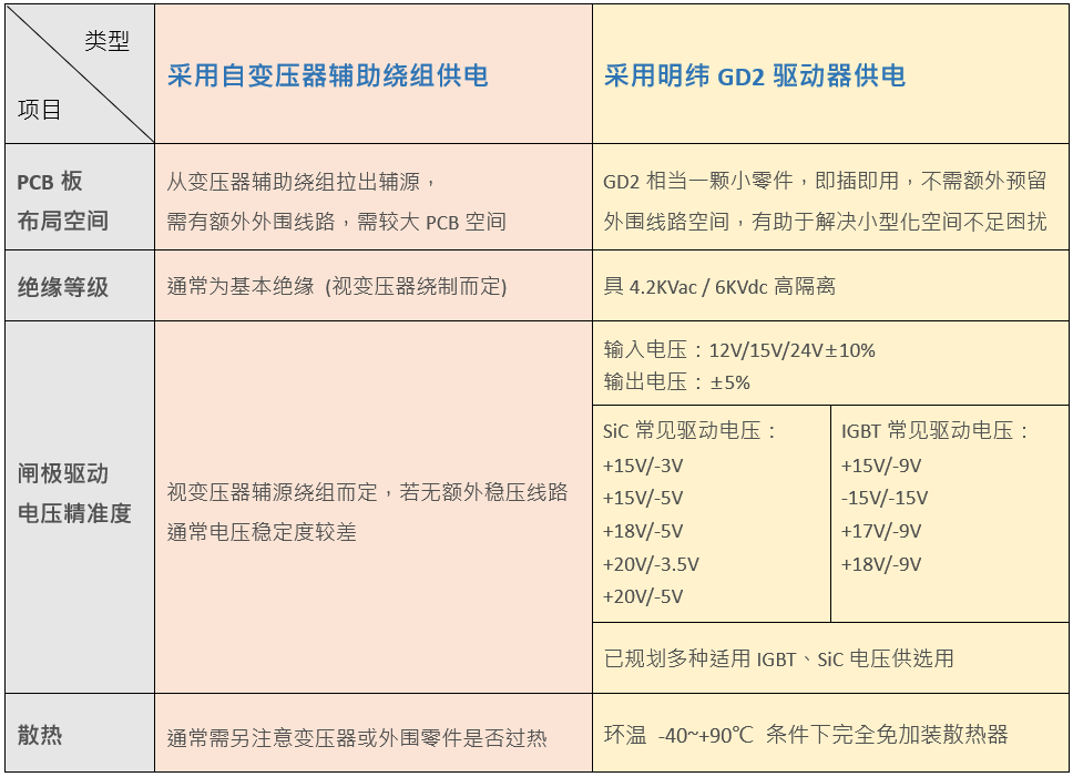 GD2 系列采模塊化設(shè)計(jì),尺寸小、具備 4.2KVac / 6KVdc 高隔離、并有多 種驅(qū)動(dòng)電壓機(jī)型供選用,相較于設(shè)計(jì)上采從系統(tǒng)內(nèi)部變壓器另拉輔源供電方式 ,使用 GD2 系列最大好處是可簡(jiǎn)化電路板上外圍驅(qū)動(dòng)線路、驅(qū)動(dòng)電壓精準(zhǔn)度更 好、不須額外加裝散熱片、隔離性較佳等,兩者驅(qū)動(dòng)方式最大差異詳如下表: