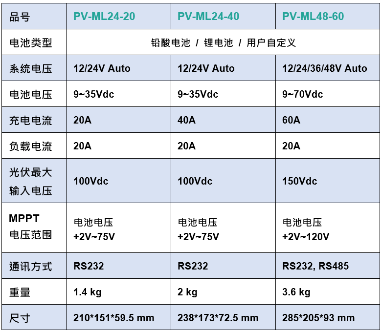 PV-ML 系列:20~60A MPPT 太陽能控制器