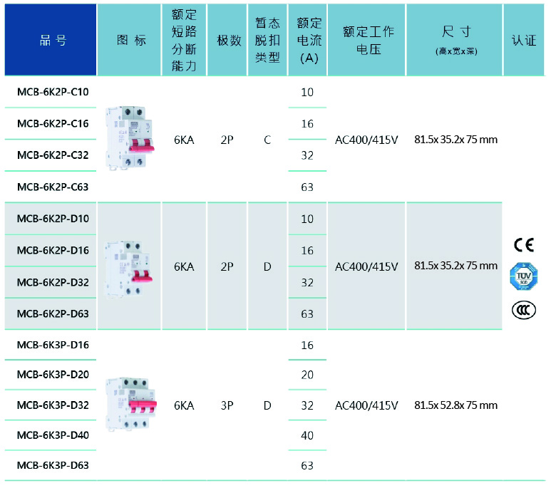 MCB-6K3P-D16 MCB-6K3P-D20 MCB-6K3P-D32 MCB-6K3P-D40 MCB-6K3P-D63