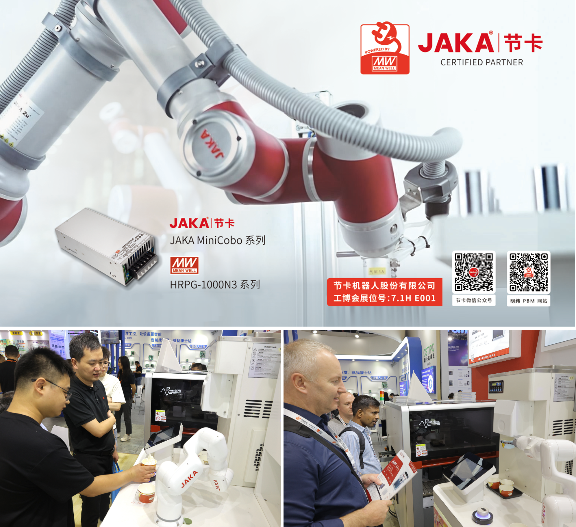 本次展會特別邀請Powered by MEAN WELL客戶——JAKA機器人聯合展出。JAKA協作機器人,使用的是明緯電源HRPG-1000N3系列,輸入電壓范圍為90~264VAC,可提供12V~48V額定電壓,滿足各種工業(yè)設備需求,320%峰值功率,可支持并聯使用,具有遙控功能。JAKA冰激凌機器人到場,給明緯展位人氣助力。