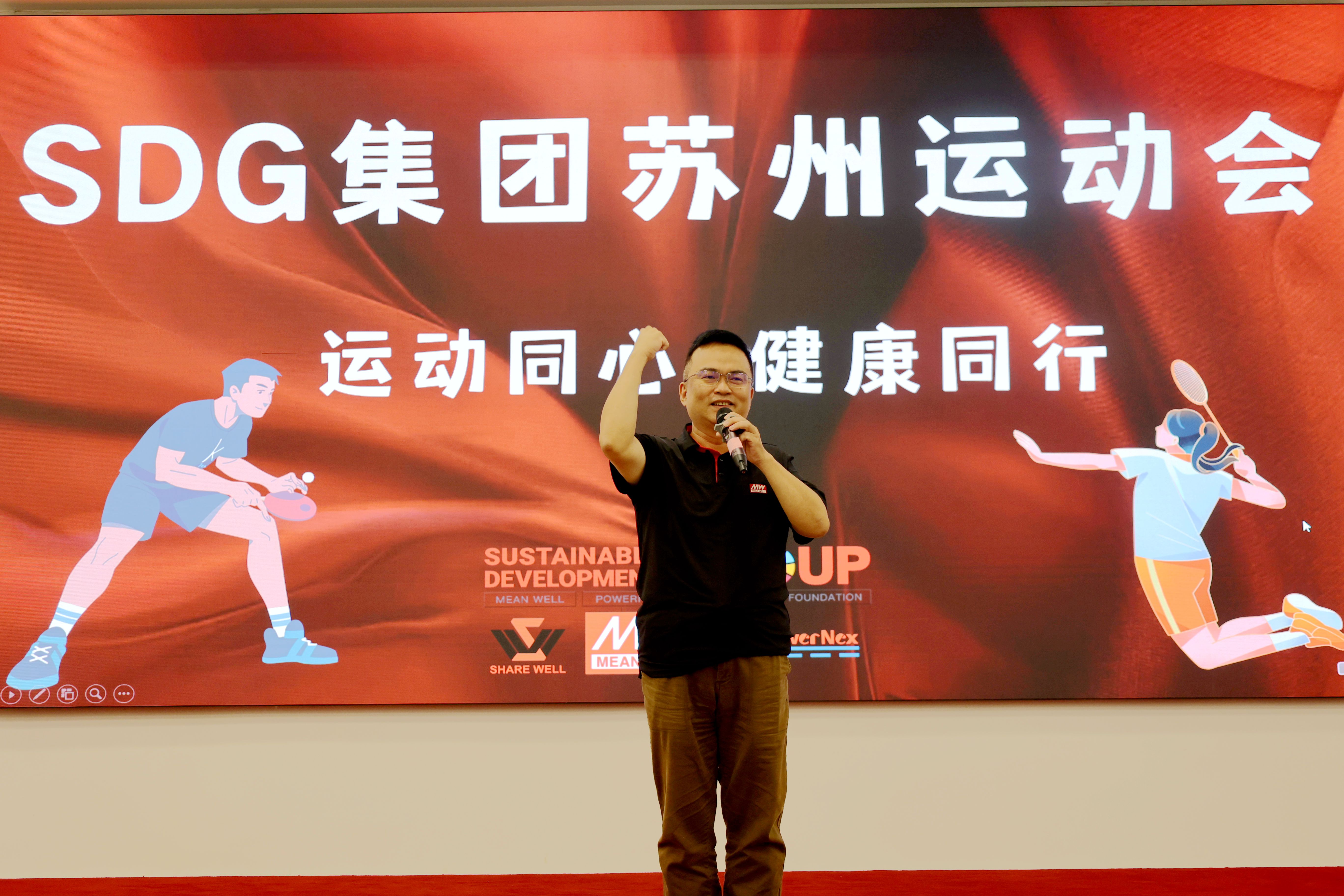 蘇州明緯副總經理何馬超先生作開場致詞。他表示,舉辦企業運動會,是SDG集團豐富員工文化生活、增強大家的體質、促進團隊協作,提升集體凝聚力的重要舉措。希望我們將團結協作、頑強拼搏的體育精神融入到工作和生活中,為公司的發展貢獻自己的力量!